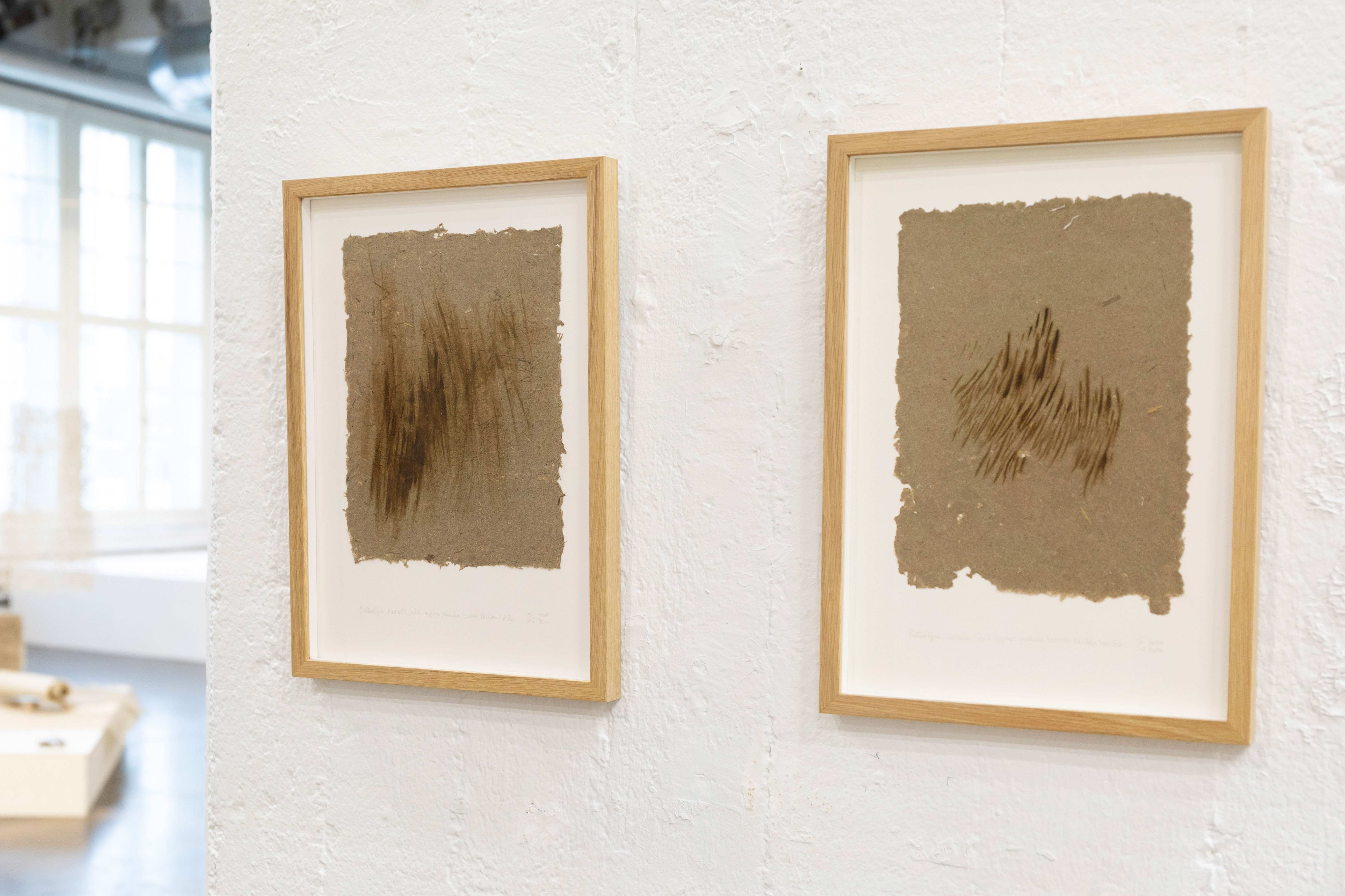 Näyttelyn taiteilijoita kiinnostaa ekologisesti kestävämmän taiteen tekemisen lisäksi materiaalin toimijuuden huomioiminen. Käsin tehdessä materiaalia muovaavat kädet ajattelevat materiaalin synnyttämiä ajatuksia. Voisikin sanoa, että materiaalin ominaisuudet nousevat taiteilijan tietoisen ajattelun rinnalle työstämään teosta.
